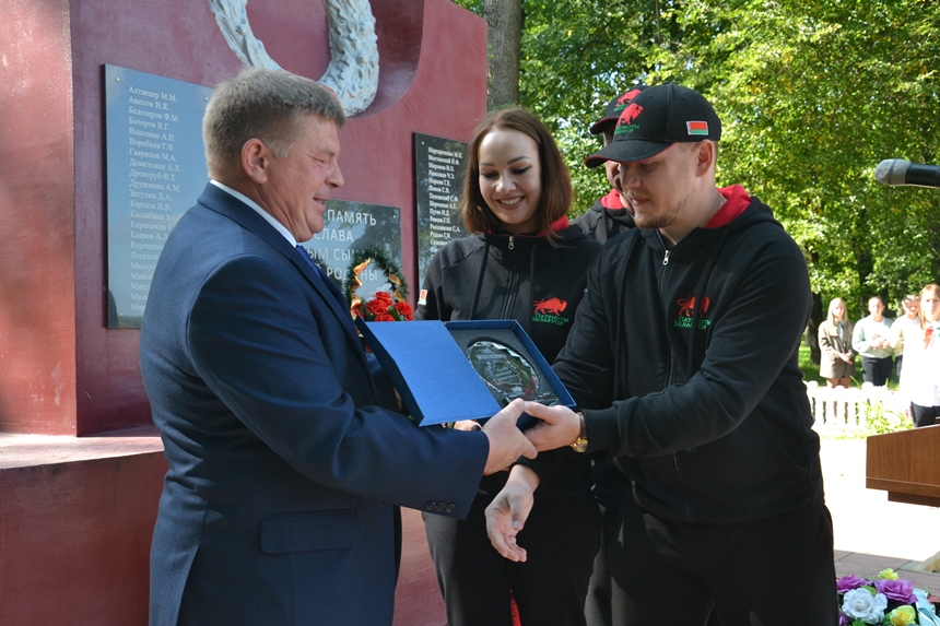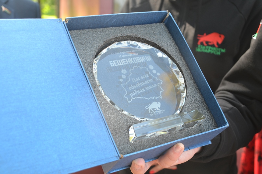В свою очередь Патриоты Беларуси преподнесли району символический кристалл с надписью «Нас всех объединит родная земля». Такой подарок организаторы акции вручают в каждом регионе.