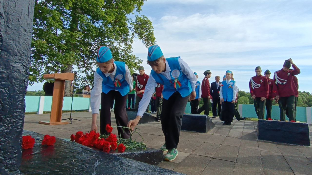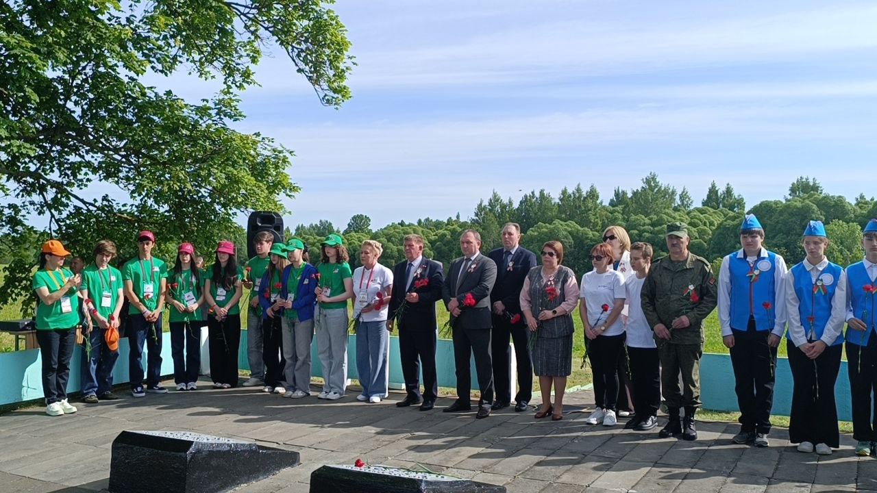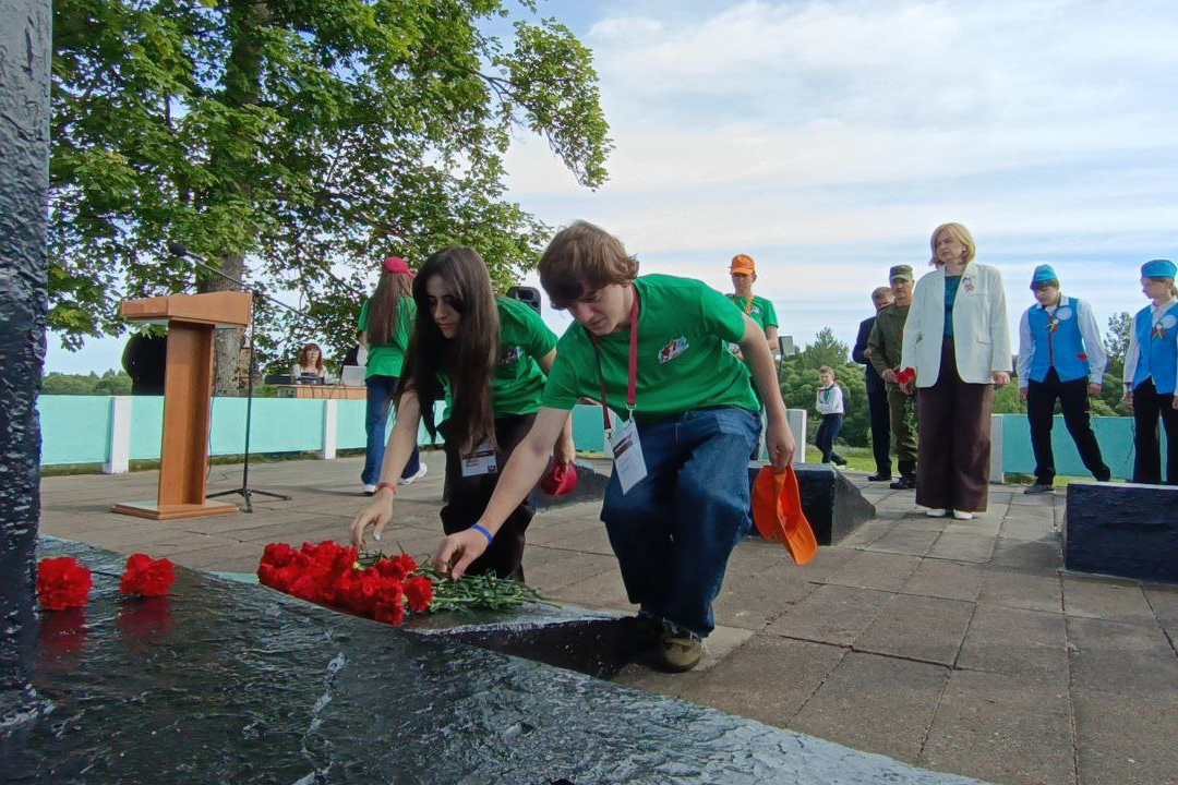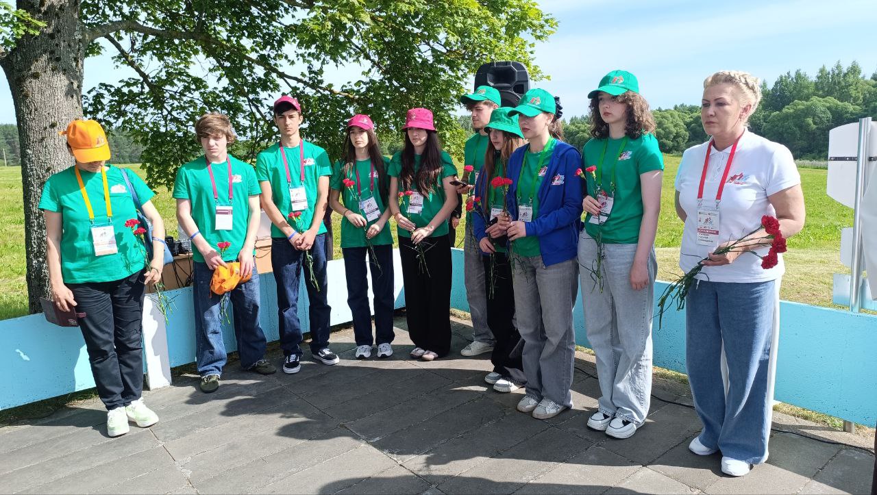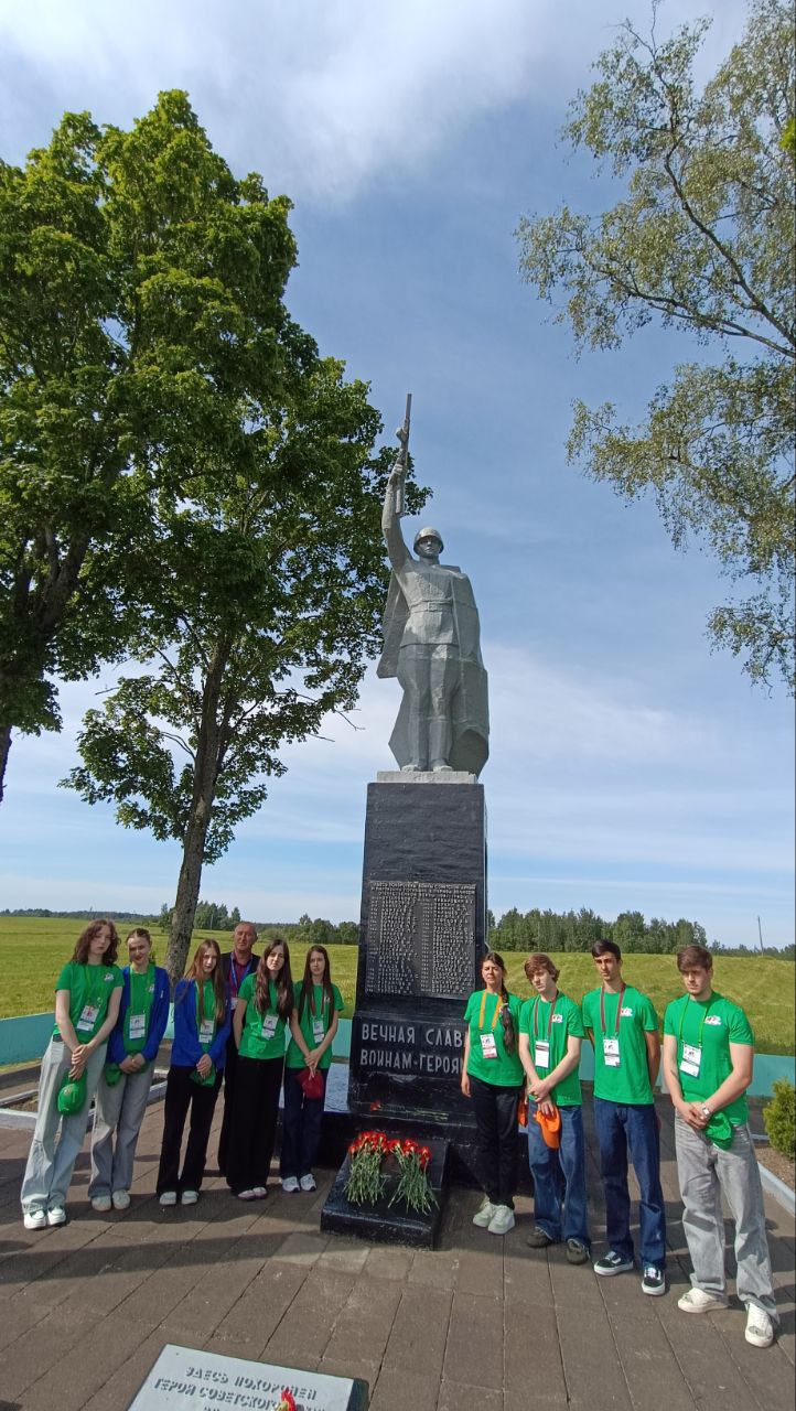 Ребятам представилась возможность побывать на братской могиле в д. Санники, где среди 99 советских солдат покоится грузинский советский поэт-воин Мирза Геловани. Гости почтили память героя минутой молчания, возложили к памятнику цветы.
