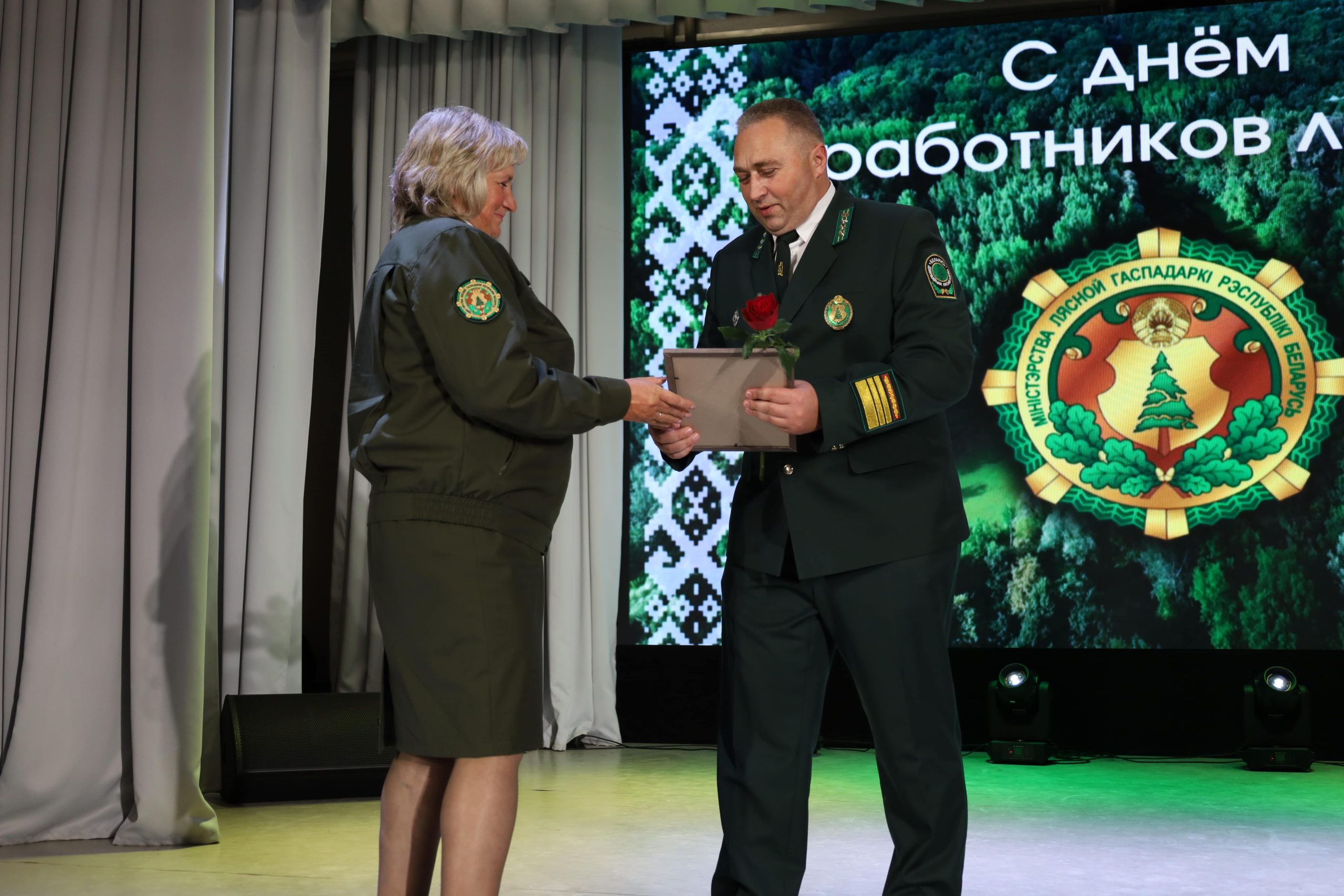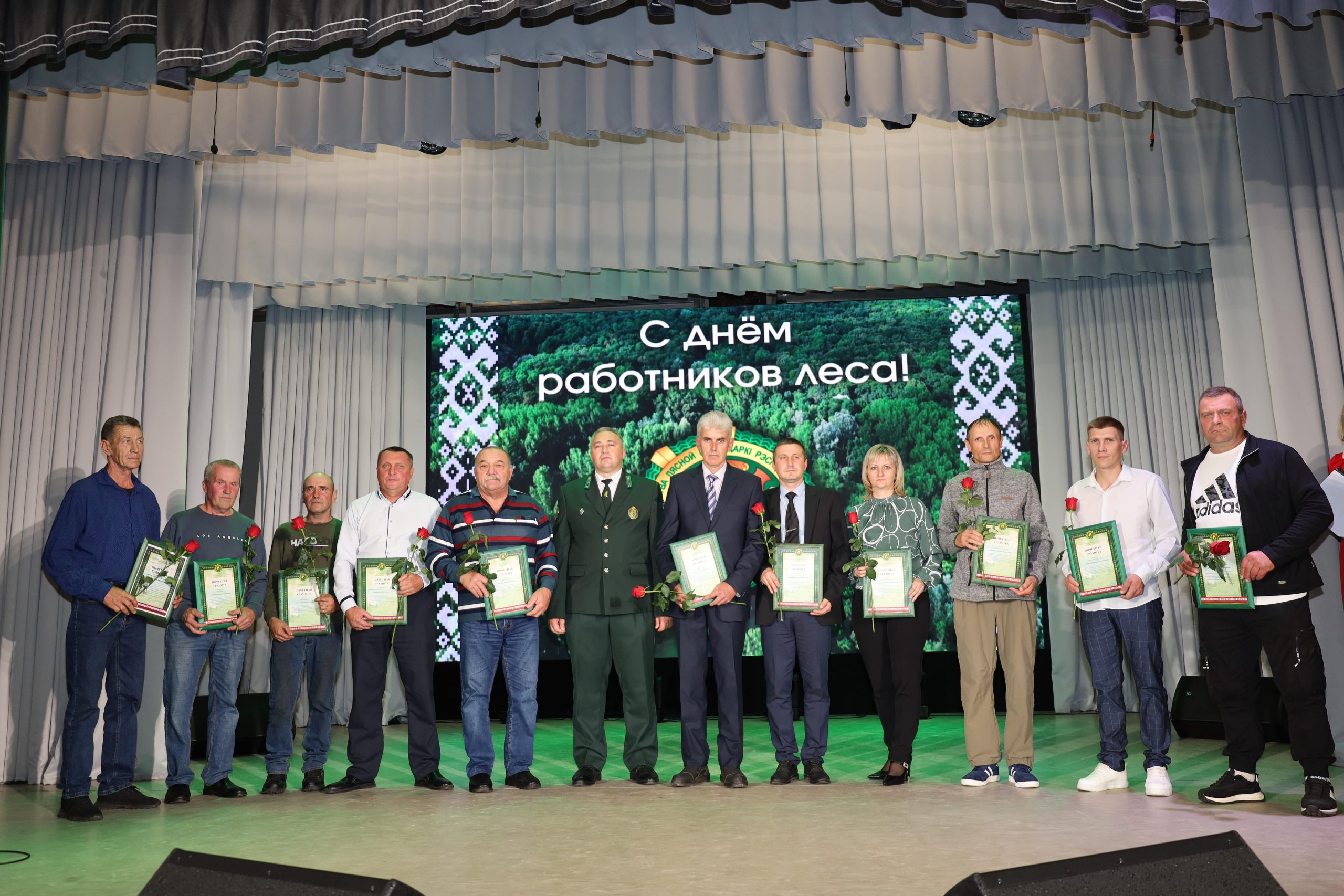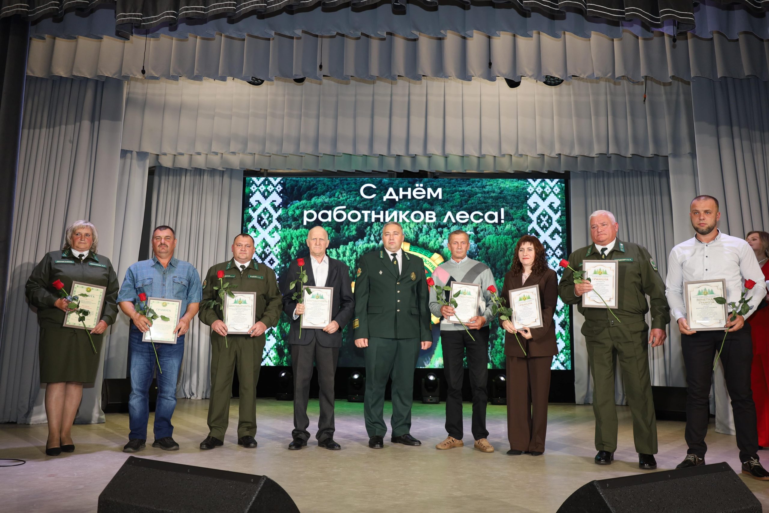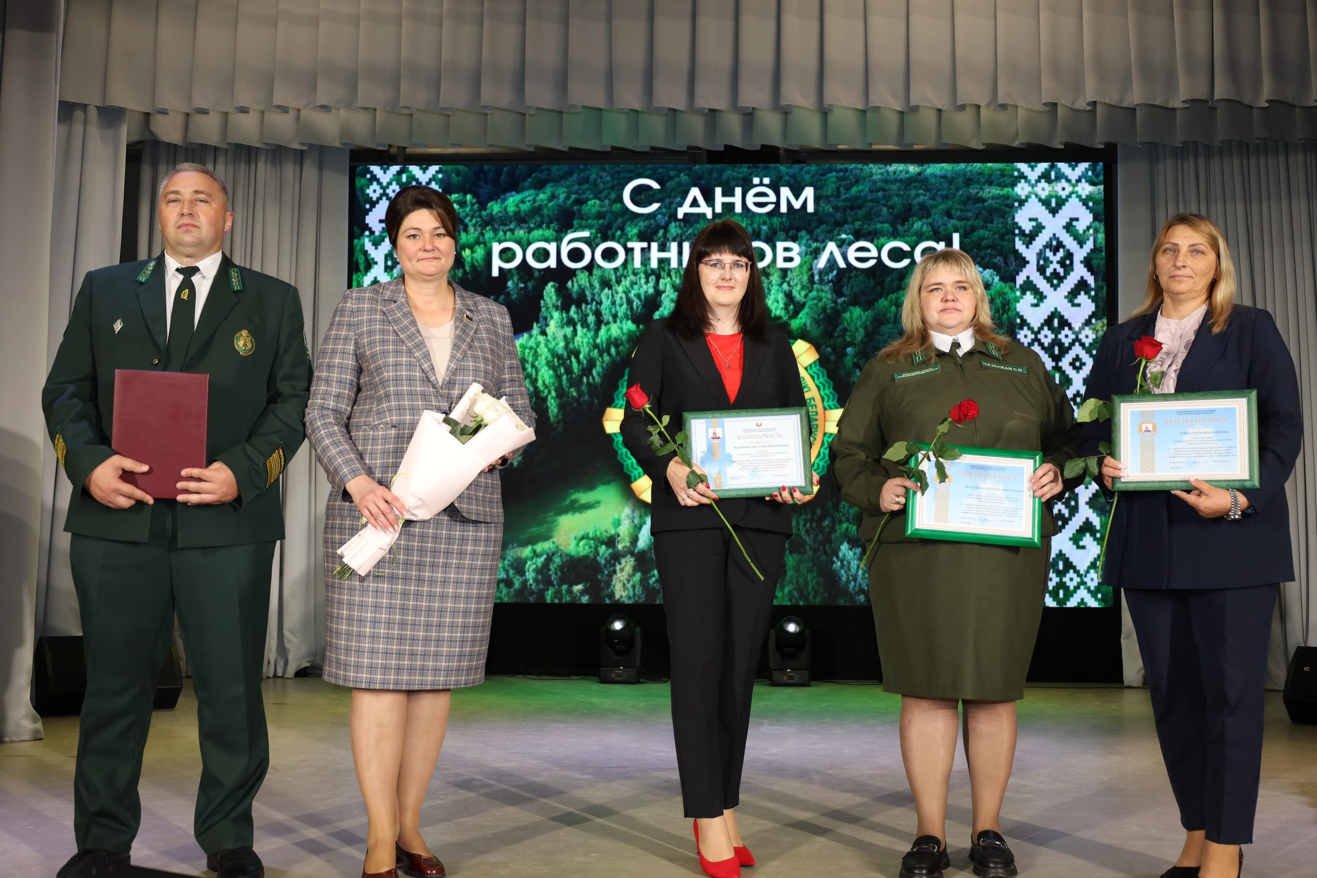На большой сцене района коллектив с профессиональным праздником поздравили председатель райисполкома Галина Владимировна Унукович, директор лесхоза Николай Викторович Серебро, председатель первичной профсоюзной организации Анна Михайловна Зайцева и первый секретарь районного комитета общественного объединения «Белорусский республиканский союз молодежи» Елена Руслановна Бабарень.