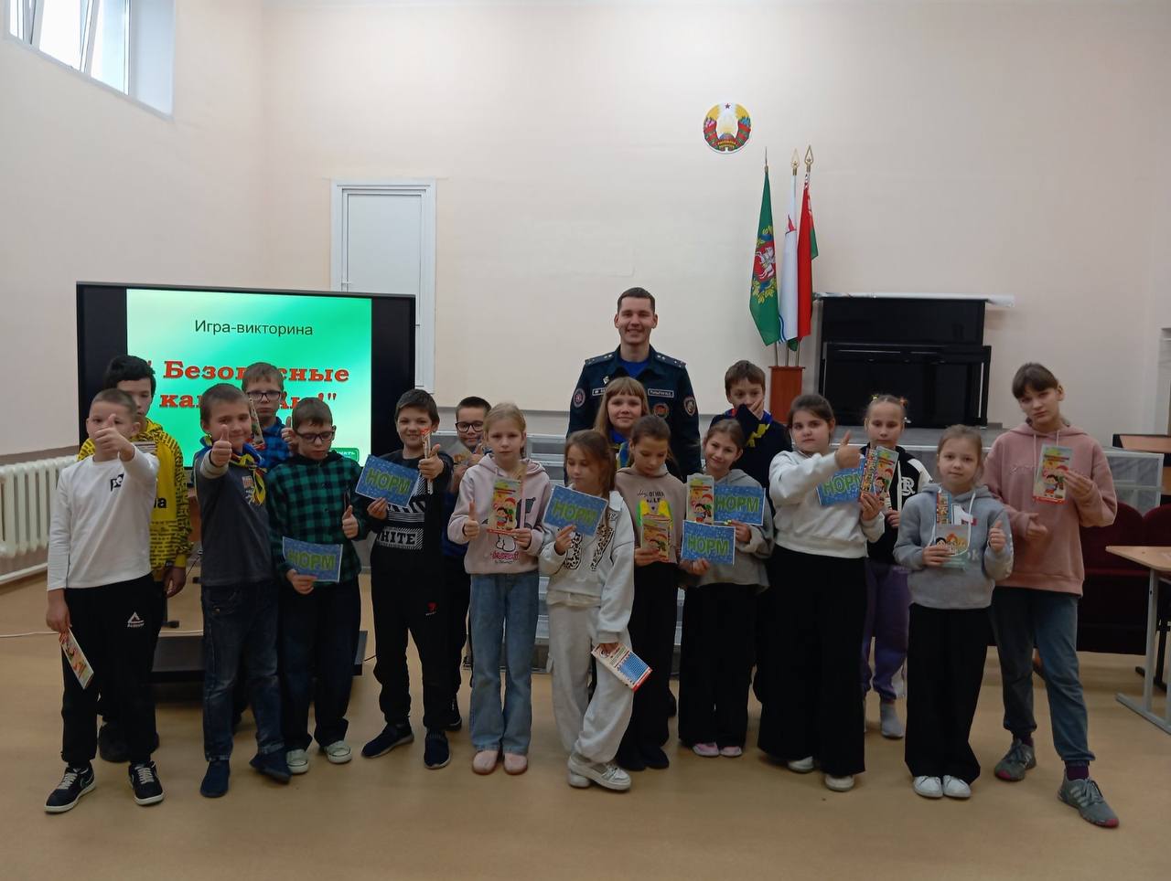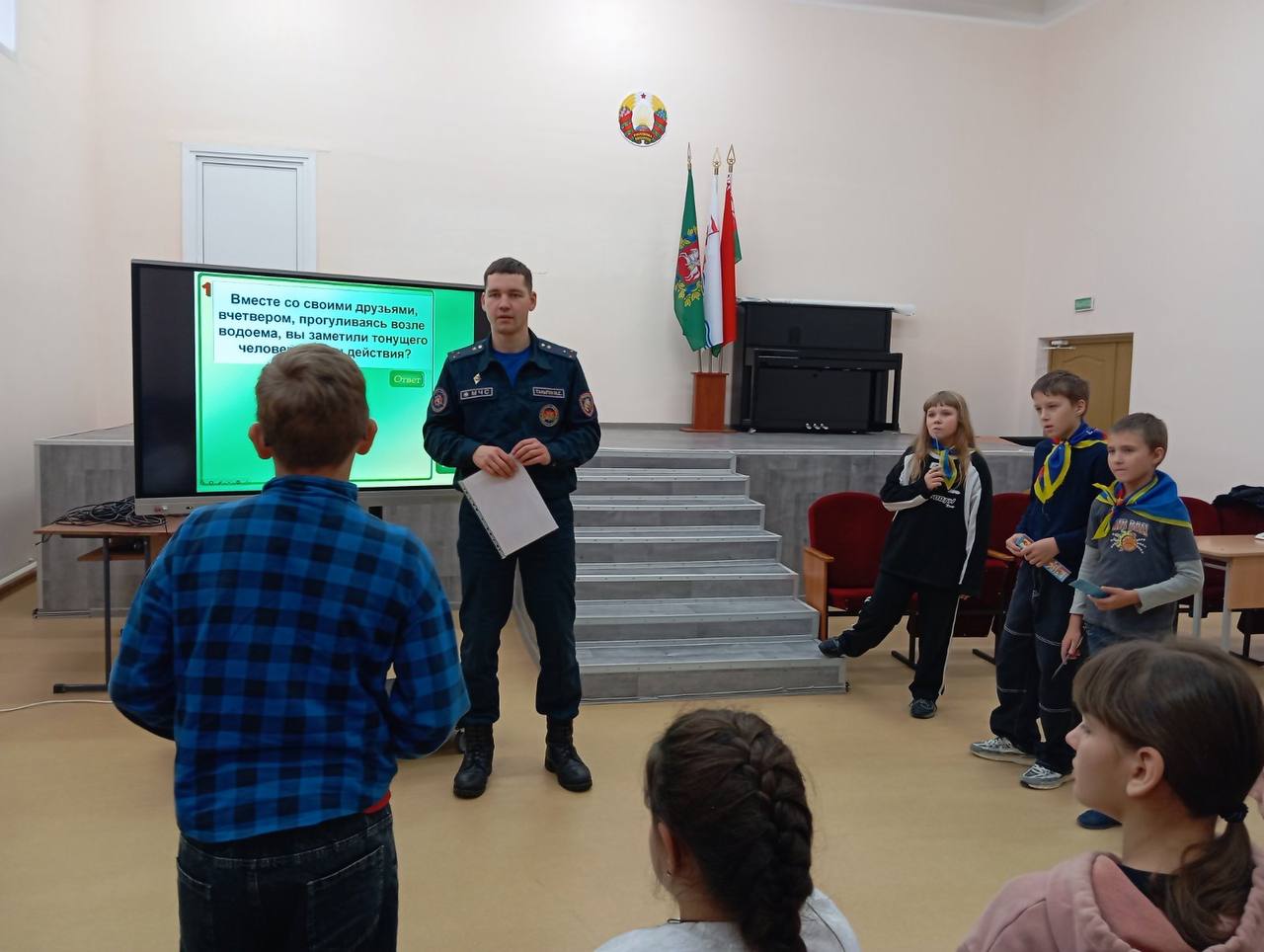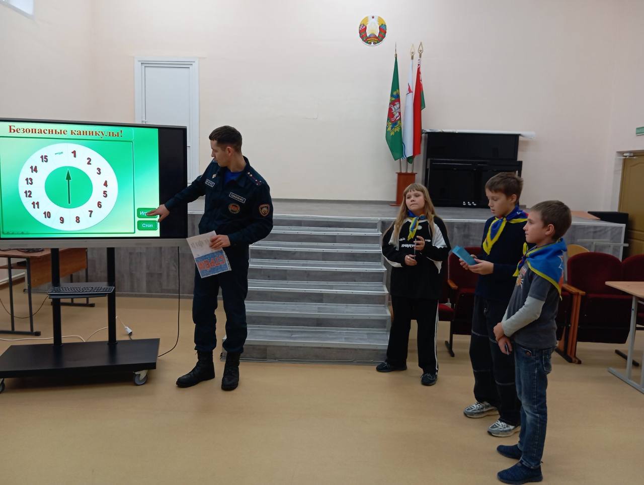 Первый этап мероприятий уже стартовал. Спасатели посетили среднюю школу №1 г.п. Бешенковичи и Островенская СШ. Для ребят они организовали обучающие игры и викторины, направленные на предупреждение чрезвычайных ситуаций в осенний период.