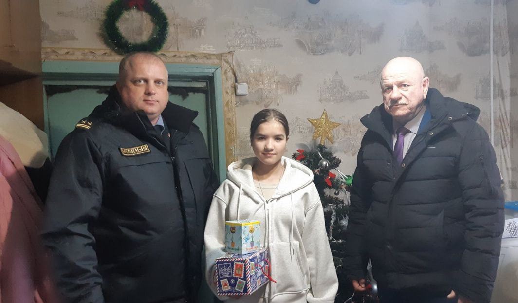 С поздравлениями с наступающими праздниками домой к юной жительнице Бешенкович Ульяне заглянули начальник РОВД Юрий Качанов и главный специалист отдела по образованию Тадеуш Квач.