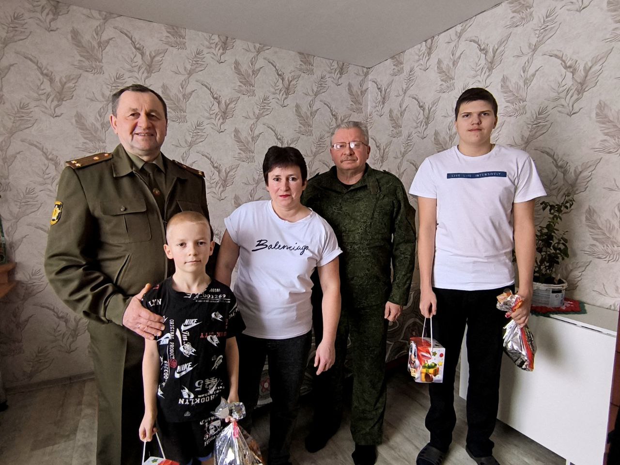 Председатель районной организации ОО «Белорусский союз офицеров» Петр Павловский и его заместитель Александр Подольский с подарками посетили семью Перегуд из г. п. Бешенковичи.