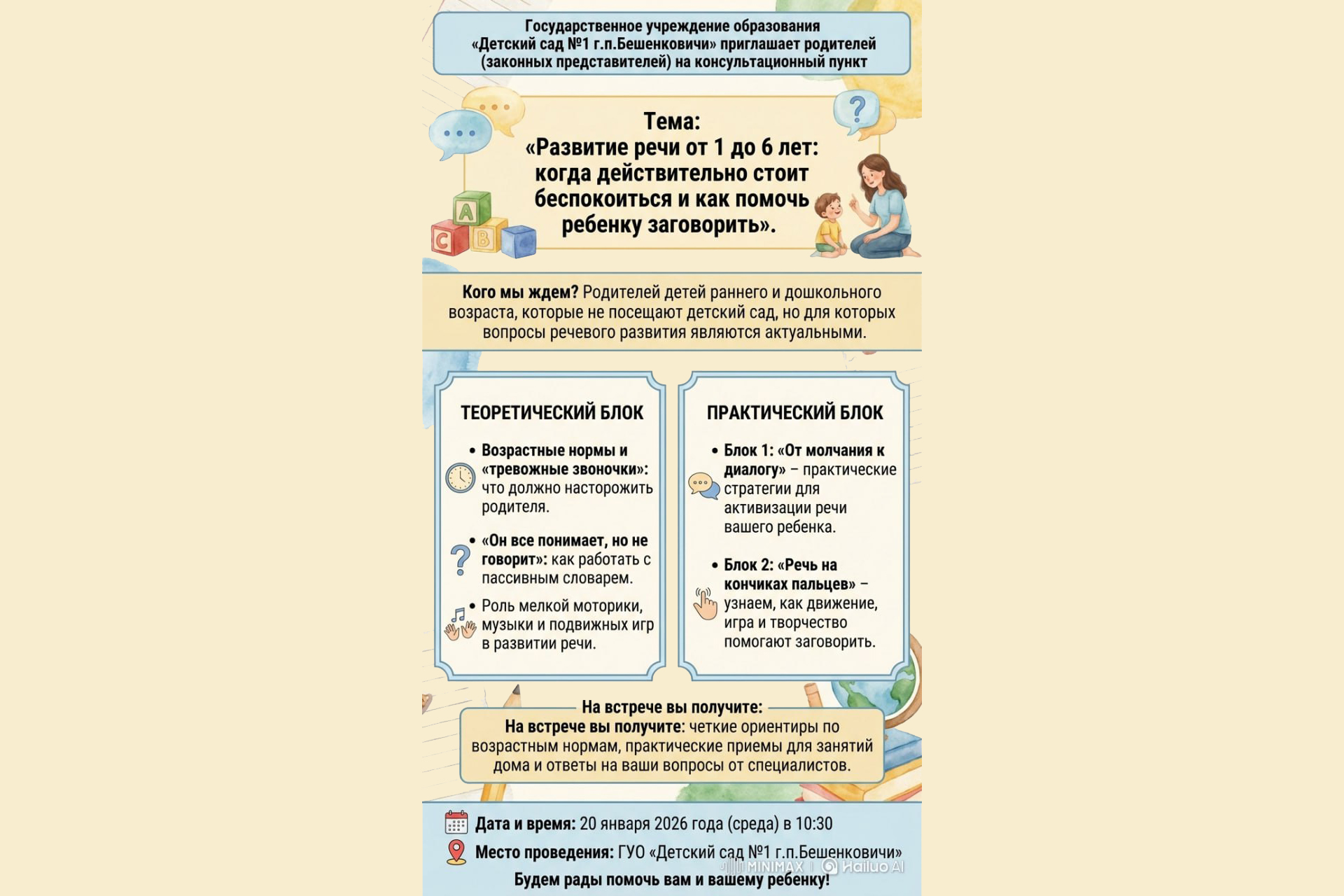 20 января на базе детского сада №1 пройдет встреча для мам и пап, которые хотят правильно развивать ребенка дома и нуждаются в помощи профессионалов.